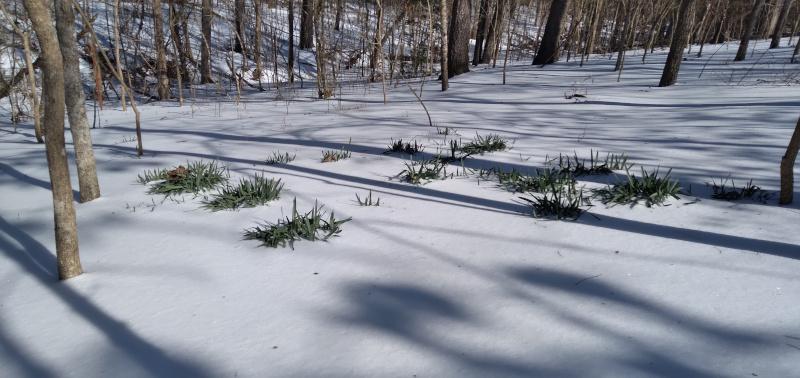 Before the storm, daffodils had begun growing because it was so warm. But now they are embedded in ice and snow.