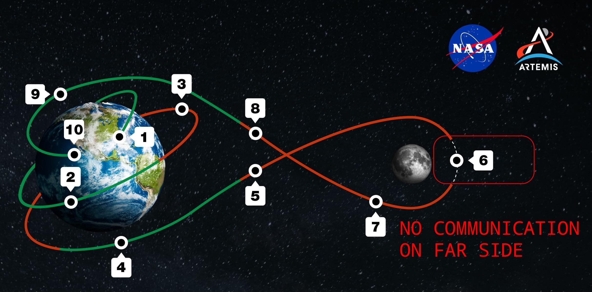 Multiple earth radio stations are required for Earth command to communicate with the crew as they are flying through space. However, there is no communication from the far side of the moon, as the moon itself blocks the radio waves.